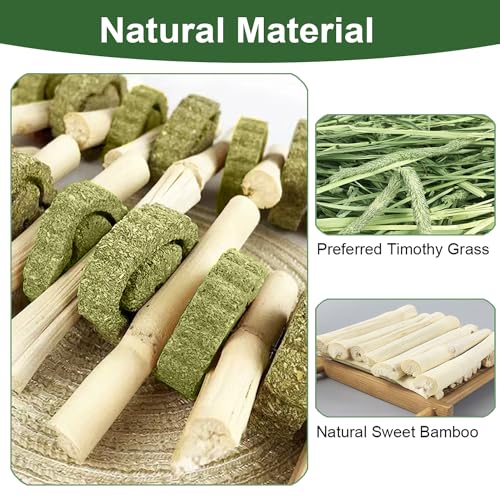 Materiale Naturale – I bocconcini per conigli sono realizzati con rami di bambù dolce naturale ed erba di pascolo di alta qualità. I rami di bambù biologici sono essiccati naturalmente, privi di pesticidi, sicuri e non tossici. Non ci sono additivi nella torta d’erba, che può mantenere il gusto e la nutrizione più originali, e può essere conservata per lungo tempo