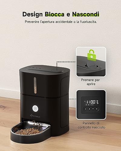 Il pannello di controllo è posizionato sul retro del distributore. Lo schermo e i pulsanti intuitivi rendono la configurazione e la modifica dei piani di alimentazione un gioco da ragazzi. Il design nascosto del pannello non solo è esteticamente gradevole, ma previene anche tocchi accidentali. Inoltre, la mangiatoia automatica apetdola è dotata di un pulsante frontale per erogare immediatamente una porzione extra, senza alterare il programma impostato.