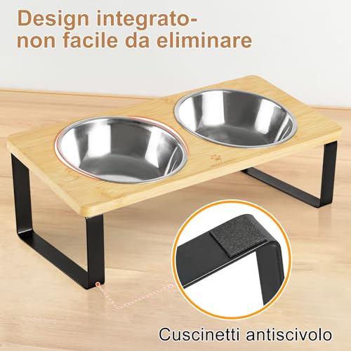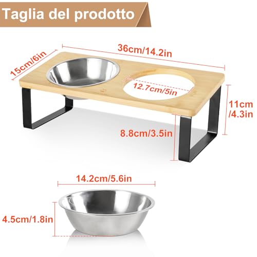 【Design aggiornato】 Sulla base del feedback dei clienti precedenti, abbiamo allargato i fori nella tavola di bambù dove sono posizionate le ciotole per una migliore vestibilità. Il design incorporato mantiene la ciotola in acciaio inossidabile in posizione, impedendo ai gatti di spostarla o ribaltarla. La posizione più alta scoraggia anche i gatti dal giocare con il cibo o dal rovesciare l’acqua con le zampe.