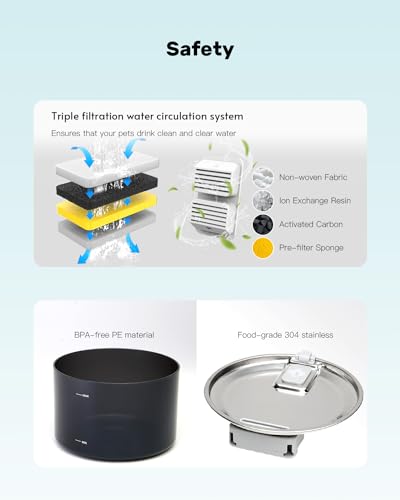 Il filtro nella fontana per animali domestici rimuove lo sporco e le particelle di cibo, mentre la spugna prefiltro cattura pelliccia e detriti. Questo sistema garantisce ai tuoi amati animali domestici l’accesso ad acqua fresca e pulita.